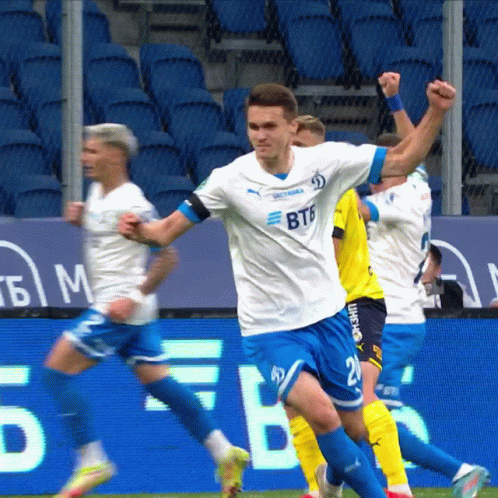 Grulev celebrates a goal for Dynamo Moscow, showing happiness and excitement on the field.