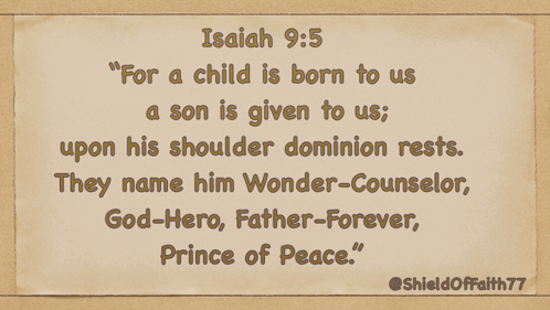 Isaiah 9:5 verse revealing the names of the promised child: Wonder-Counselor, God-Hero, Father-Forever, Prince of Peace.