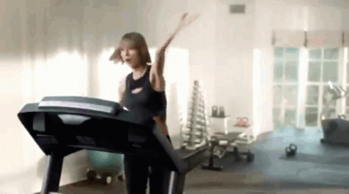 A woman exercising on a treadmill loses her balance and falls off the machine in a gym setting.