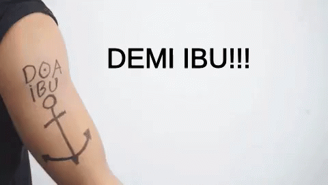 A person with a 'Doa Ibu' tattoo on their arm lifts weights, showing dedication to their mother.