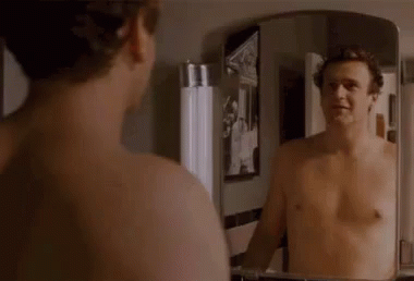 Jason Segel looks at his reflection in a bathroom mirror in a scene from Forgetting Sarah Marshall.