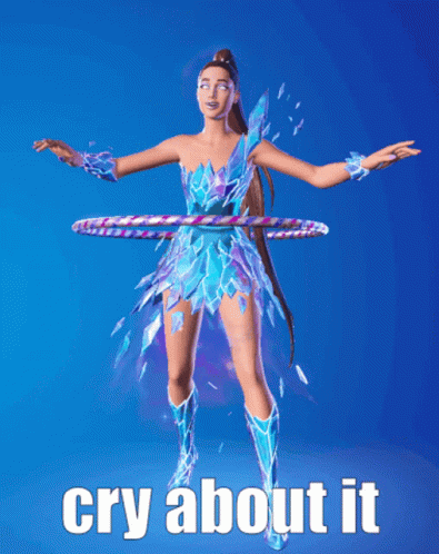 Fortnite character Ariana Grande performs a hula hoop emote with a crystalline dress, captioned 'cry about it'.