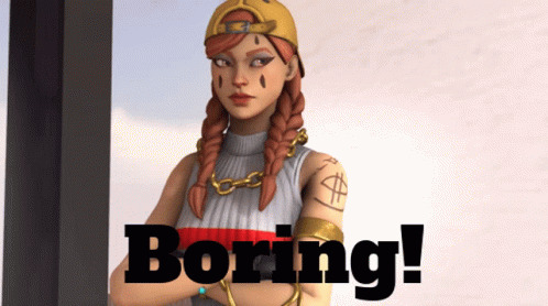 Fortnite character Aura looking unimpressed with the word 'Boring!' displayed on screen.