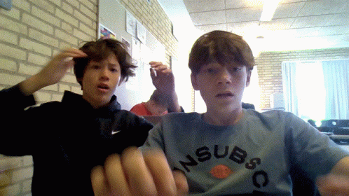 Two boys perform a Fortnite dab in school, one wearing an 'UNSUBSCRIBE' shirt in a classroom setting.