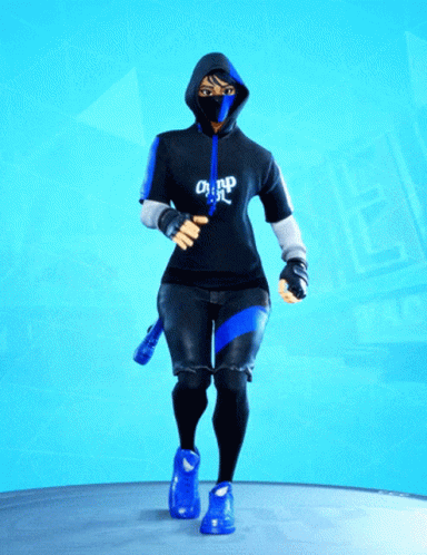 The Fortnite Ikonik Female character performs a dance emote, wearing a black and blue hoodie.