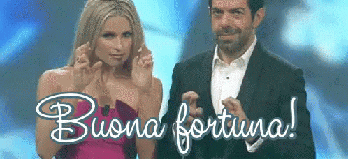 Michelle Hunziker and Piergiorgio Favino wish 'Buona fortuna!' with crossed fingers, offering encouragement.