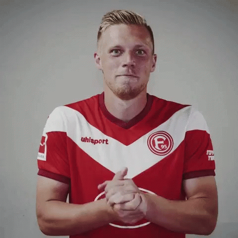 Fortuna Duesseldorf player in red and white Uhlsport jersey clapping hands, looking at camera.