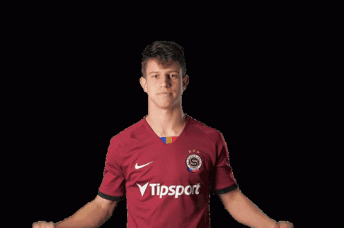 Footballer Hložek flexes his muscles while wearing an AC Sparta Prague Fortuna Liga jersey.