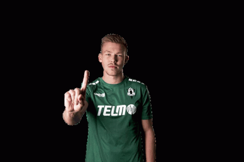 FK Jablonec player Plechatý in a green Telmo jersey, pointing his finger upwards.