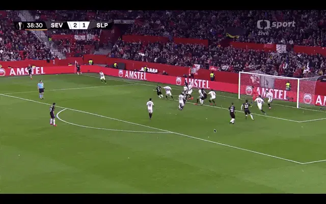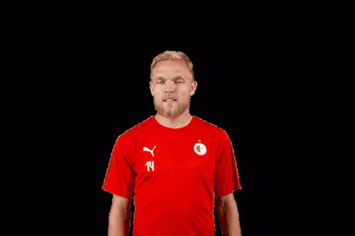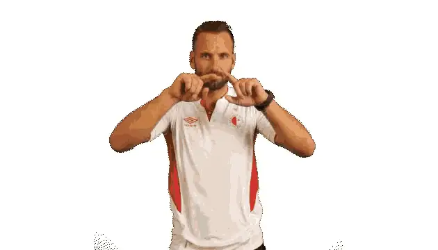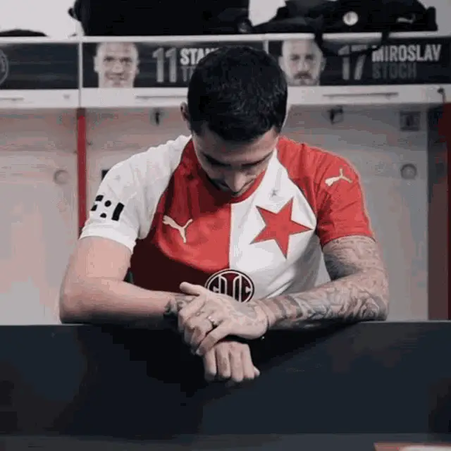 Mick Van Buren in a red Slavia Prague jersey makes a 'can't hear' gesture during a Fortuna Liga match.