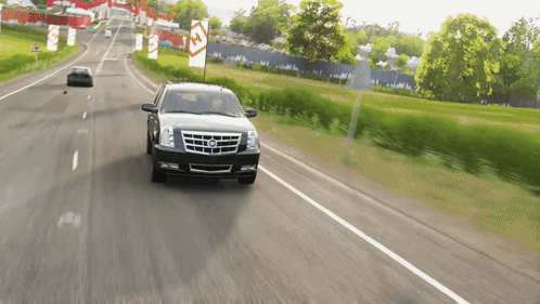 A black Cadillac Escalade ESV drives along a scenic road, overtaking other vehicles in a race.