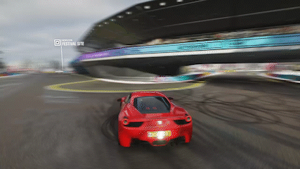 A red Ferrari 458 Italia performs impressive drifts and burnouts on a wet track in Forza Horizon 4.