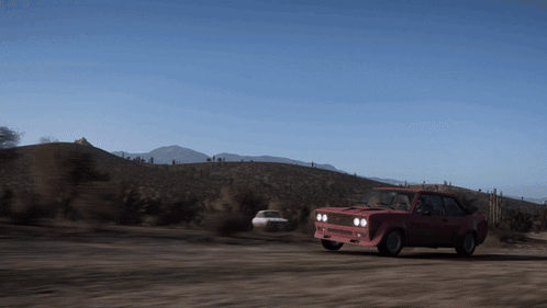 a red car is driving on a dirt road