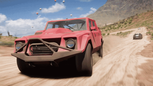 A red Lamborghini LM 002 drives off-road through a desert landscape in the video game Forza Horizon 5.