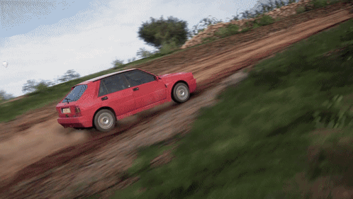 A red Lancia Delta HF Integrale Evo rally car drives off-road on a dirt track in Forza Horizon 5.