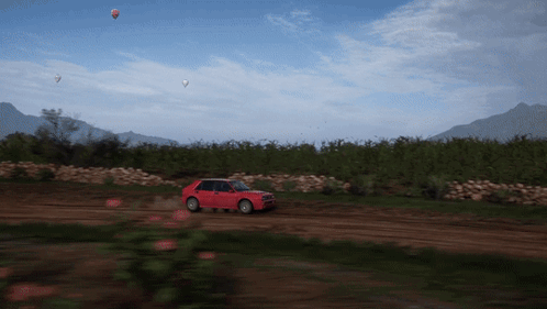A red Lancia Delta HF Integrale Evo races off-road in Forza Horizon 5, kicking up dust on a dirt track.