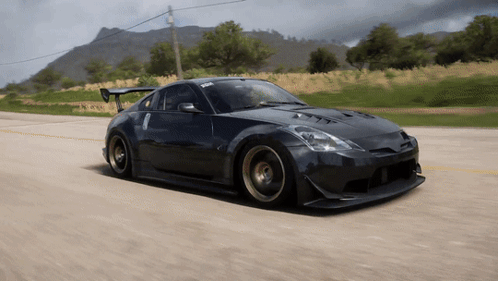 A customized black Nissan 350Z from Donut Media drives through scenic roads in Forza Horizon 5.