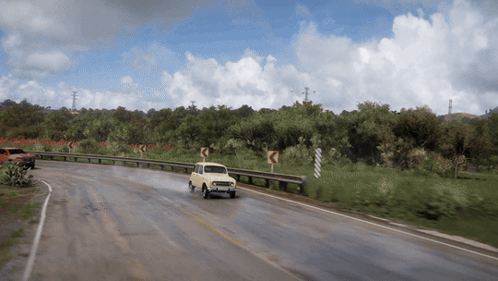 a car is driving down a road with trees on the side of it