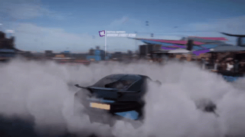 A black Bugatti Divo performs impressive drifts and donuts, creating thick tire smoke in Forza Horizon 5.