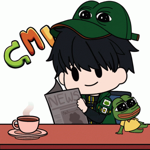 Fourleafclover Pepe Clover Boy enjoys his morning coffee and newspaper with Pepe the Frog, saying 'GM!'.