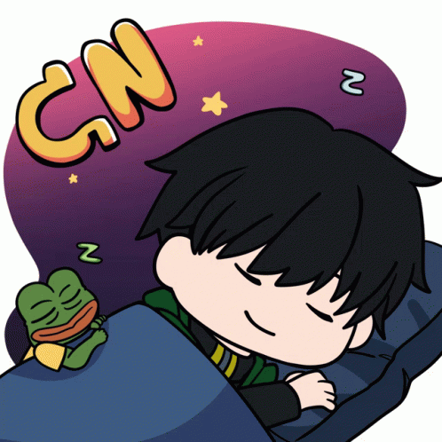 Cute cartoon boy, Pepe Clover Boy, sleeping soundly with Pepe The Frog, with 'GN' text for goodnight.