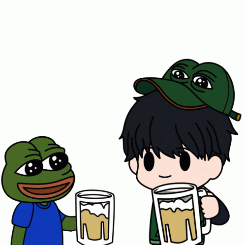 Pepe the Frog and Clover Boy share a celebratory toast with mugs of beer, clinking them together.
