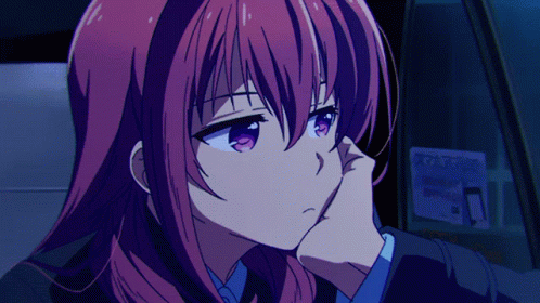 Foxe Loh, the red-haired anime girl, looks emotional and thoughtful, resting her chin on her hand.