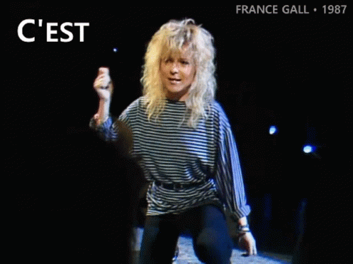 France Gall performs her hit song 'C'est Bon Que Tu Sois Là' live on stage, full of energy.