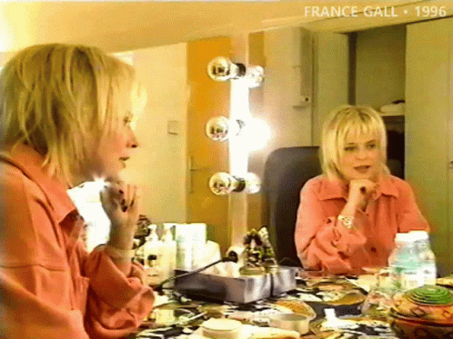 French singer France Gall sits at a vanity table, reflecting in a mirror and discussing something 'heavy' in French.