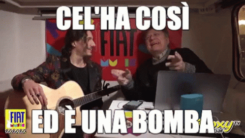 Francesco Vinciotti with another man, laughing as he plays guitar, featuring the Italian caption "Cel'ha Così Ed È Una Bomba."