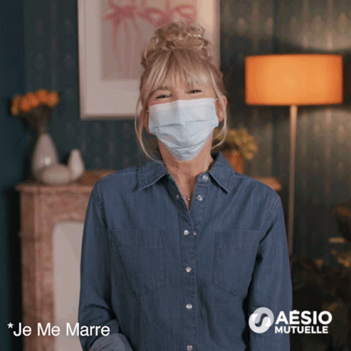 Françoise Aesio, wearing a face mask, holds up a sign with 'JMM' (Je Me Marre) in a cheerful moment.