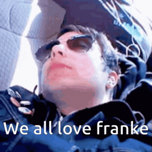 Frank Iero, wearing sunglasses, appears to be resting or cuddling, with a loving message 'We all love franke' displayed.