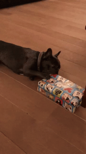 French Bulldog Rocco excitedly unwraps a gift on a wooden floor, using his paws and mouth to tear into the wrapping.