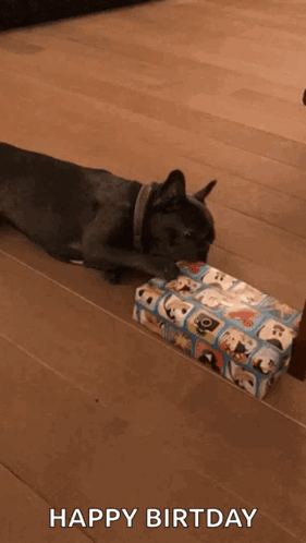 A French Bulldog, Rocco from Antwerp, tries to open a birthday gift on a wooden floor.