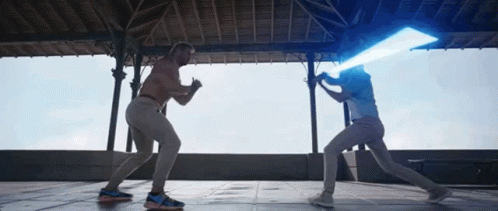 Ryan Reynolds as Free Guy battles with a lightsaber against another man in an outdoor pavilion.