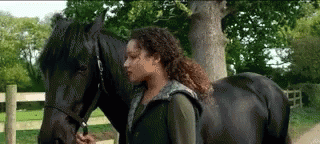 Jaylen Barron as Zoe Phillips from Free Rein stands with a black horse, joined by another character.