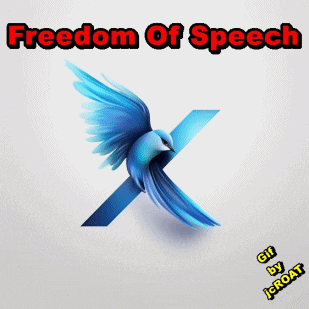 A vibrant blue bird, reminiscent of the Twitter logo, flies over a stylized 'X' with 'Freedom Of Speech' text.