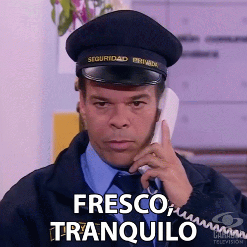 Mauricio, a private security guard, on the phone, delivering his iconic 'Fresco, Tranquilo, Ventarrón' lines.