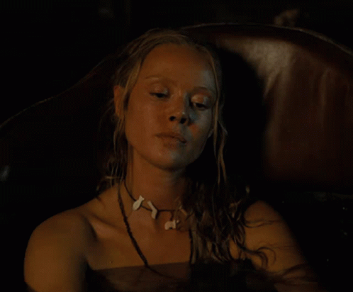 Freydis Eriksdotter from Vikings Valhalla with wet hair and a shell necklace, staring intensely.