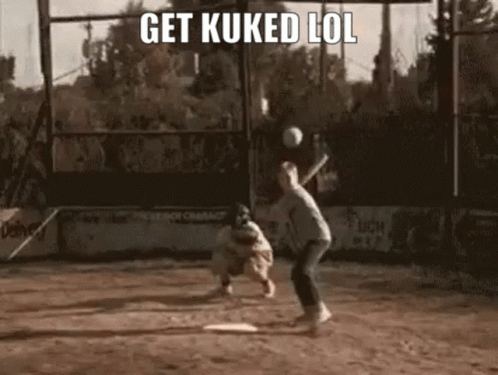 A batter faces a comically oversized baseball, leading to a 'Get Kuked' moment on the field.