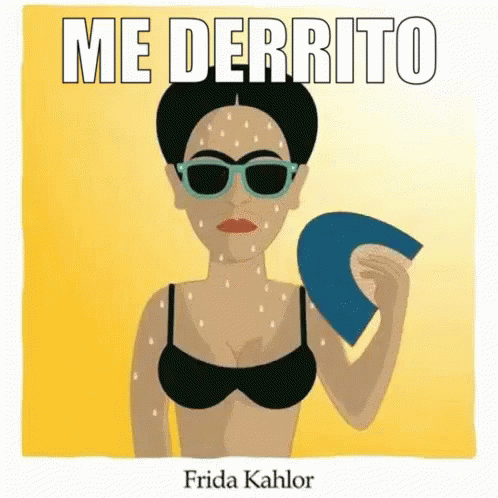 Cartoon of Frida Kahlo feeling overheated, saying 'Me Derrito' (I'm Melting) while fanning herself.