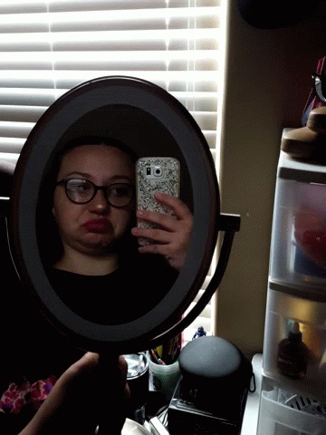 Person taking a mirror selfie, making a funny face, showcasing their Friday makeup look in a room with blinds.