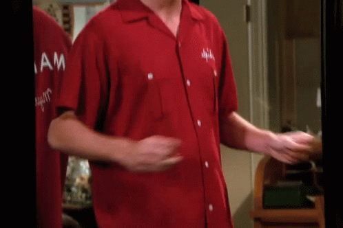 Chandler Bing looking uncomfortable and awkward while adjusting his pants, possibly at a tailor, in a weird moment.