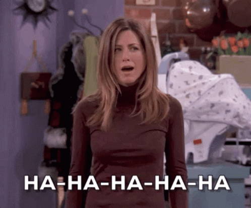 Rachel Green (Jennifer Aniston) delivers her famous fake laugh in Friends, with 'HA-HA-HA-HA-HA' text.