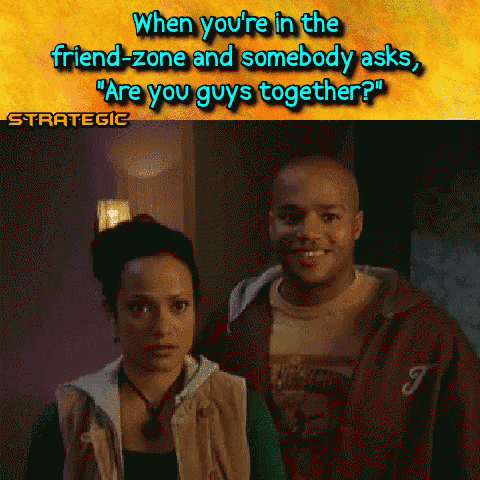 Donald Faison and Judy Reyes in a classic friendzone moment, reacting to the 'Are you guys together?' question.