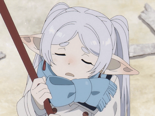 Frieren, the elf mage, exhales a visible puff of cold breath while holding her staff in a chilly environment.