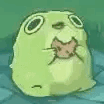 A cute, small, green cartoon frog blinks while eating a cat-like creature.