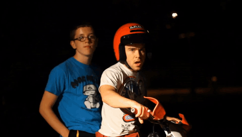 Froggy Fresh on a dirt bike with a friend, both looking at the camera in a dark setting.