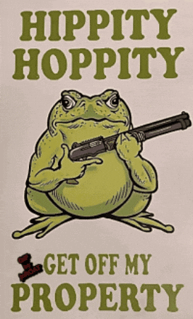 A frogman holding a shotgun with the text 'Hippity Hoppity Get Off My Property' on a poster, featuring jcROAT.