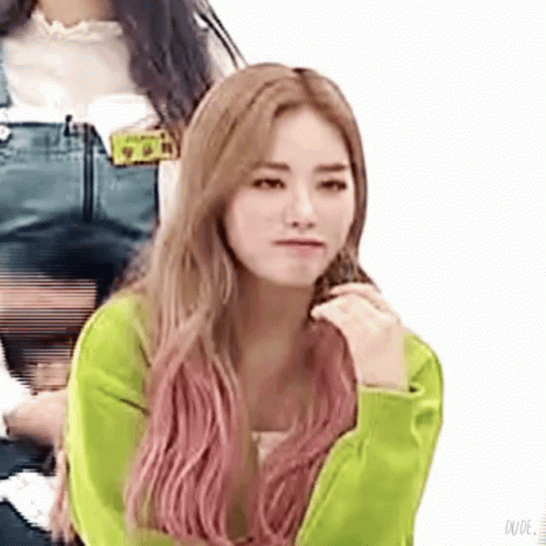 Fromis_9 member Park Jiwon (Jiwon) makes a funny face and winks, wearing a green sweater.